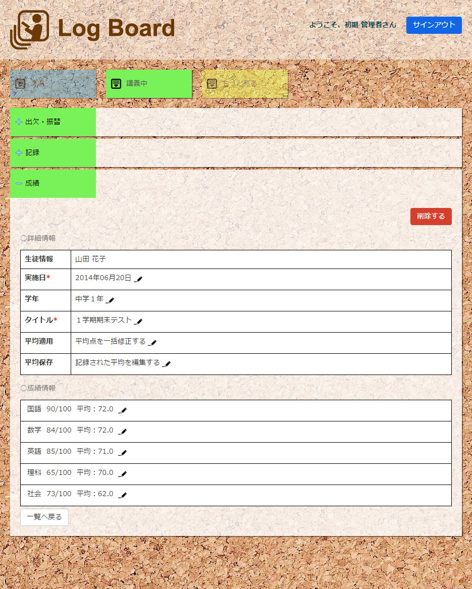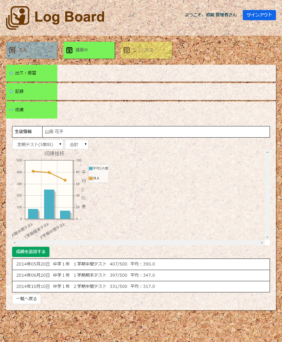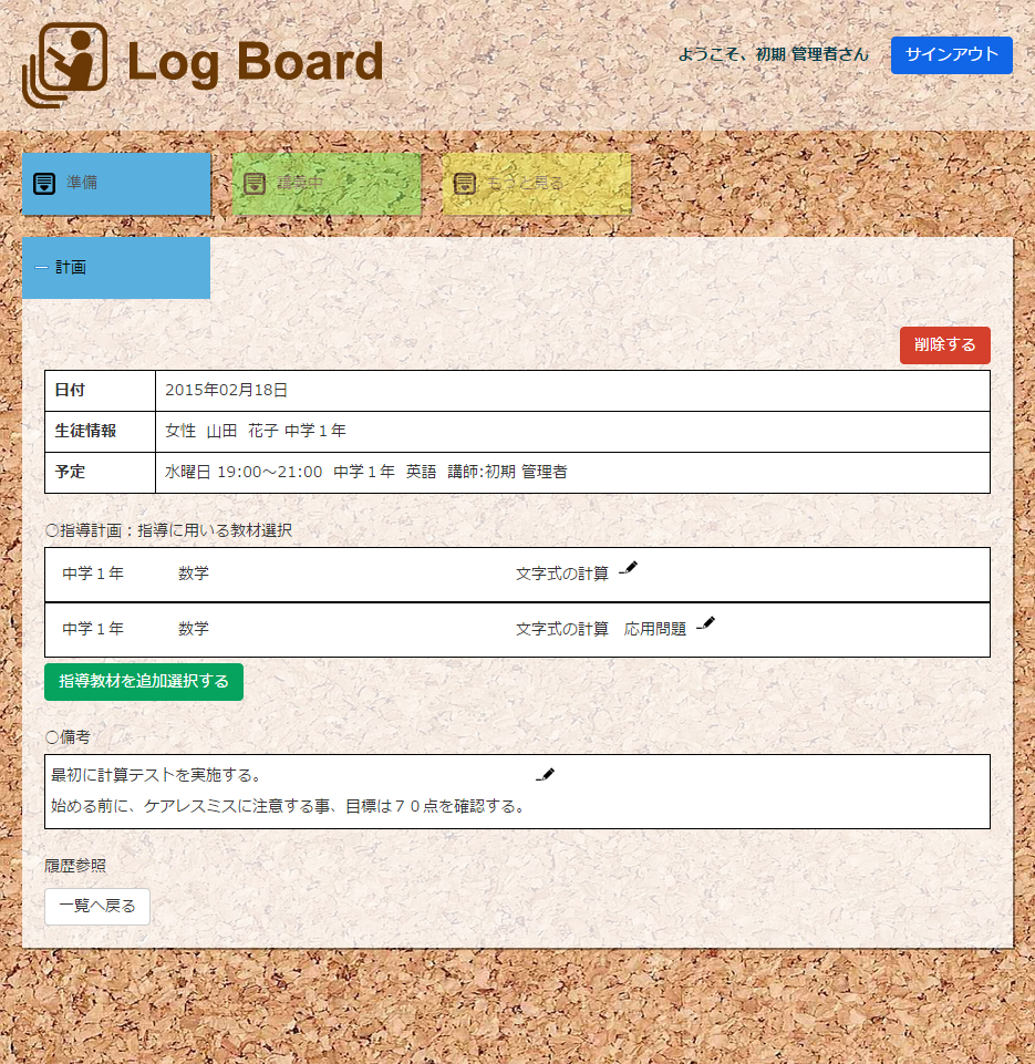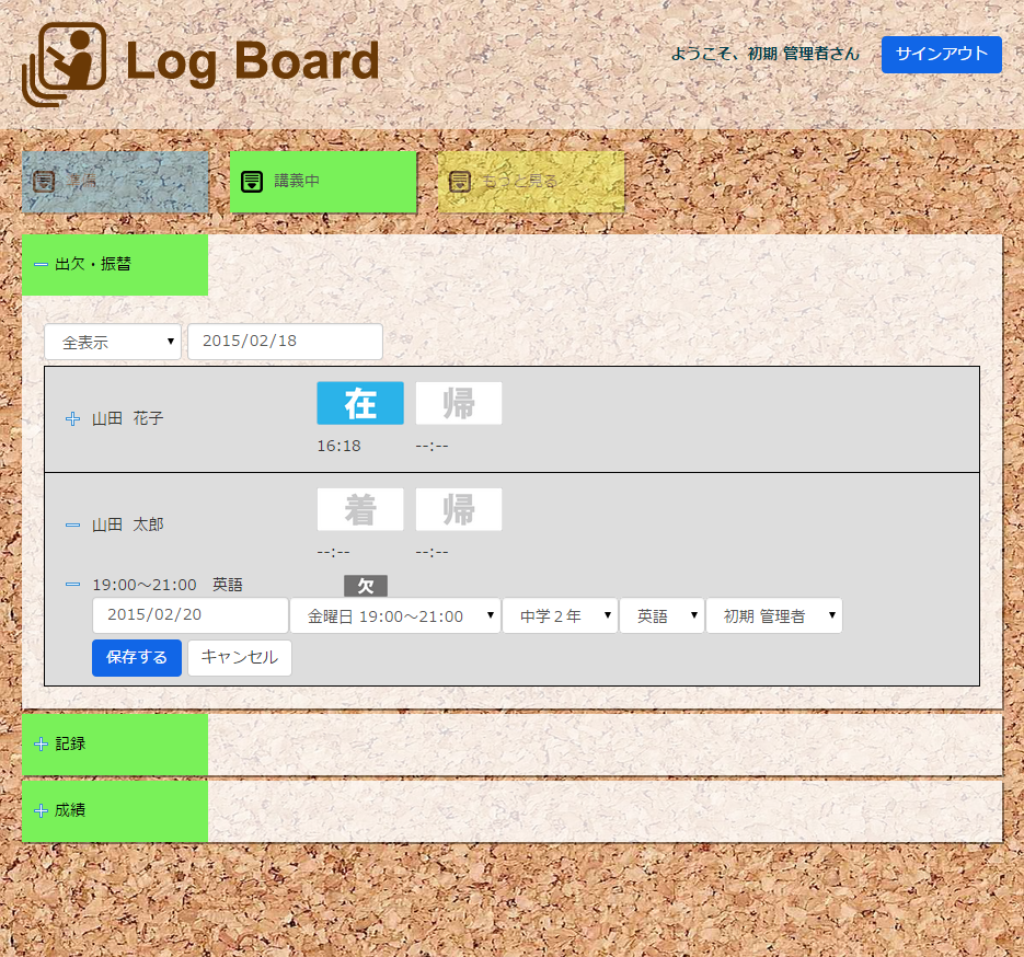 はじめまして、Log Board(ログボード)を開発したコラボプラネットの西原です。私も皆様と同様に学習塾を経営しています。 教室を開くにあたって、生徒の管理をどうしようかと色々なサイトを調べました。しかし、欲しい機能がなかったり、 価格が高くて導入できなかったりと、結局、これだ!というものを見つけることができませんでした。 そこで開発したのがこの生徒管理システムです。PC、タブレットどちらにも対応した操作性の高い管理システムです。 同じ悩みを持つ方にも使って頂きたいと思い、基本機能は無料でご利用頂けます。 日々の教務のサポートにご利用ください。