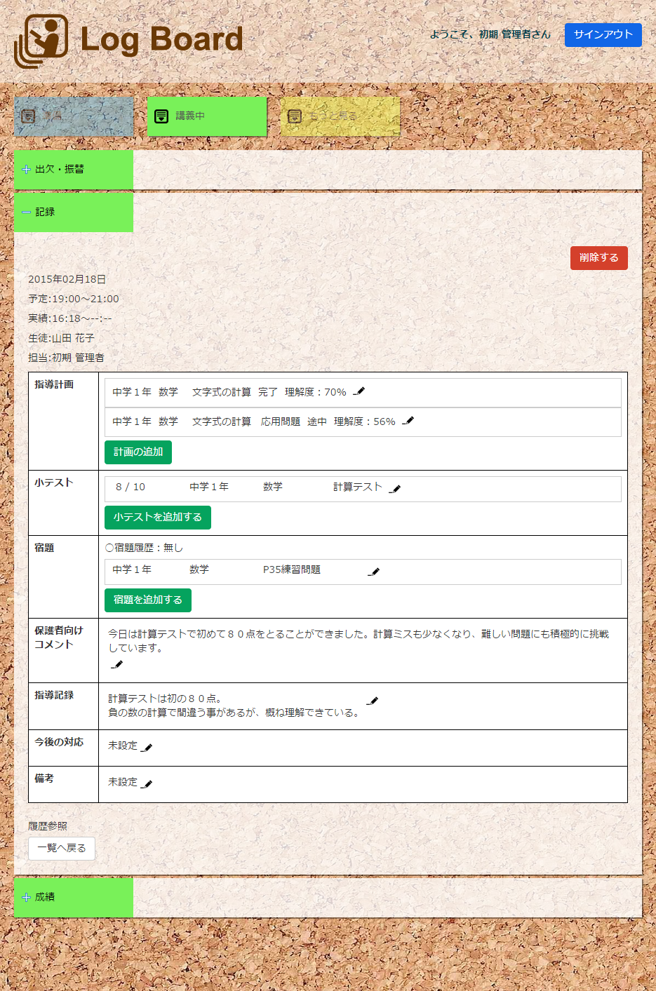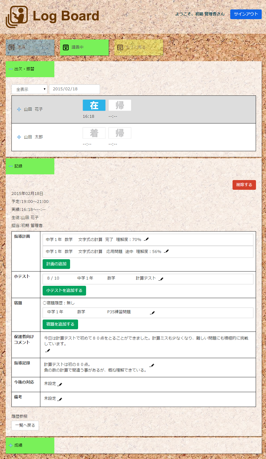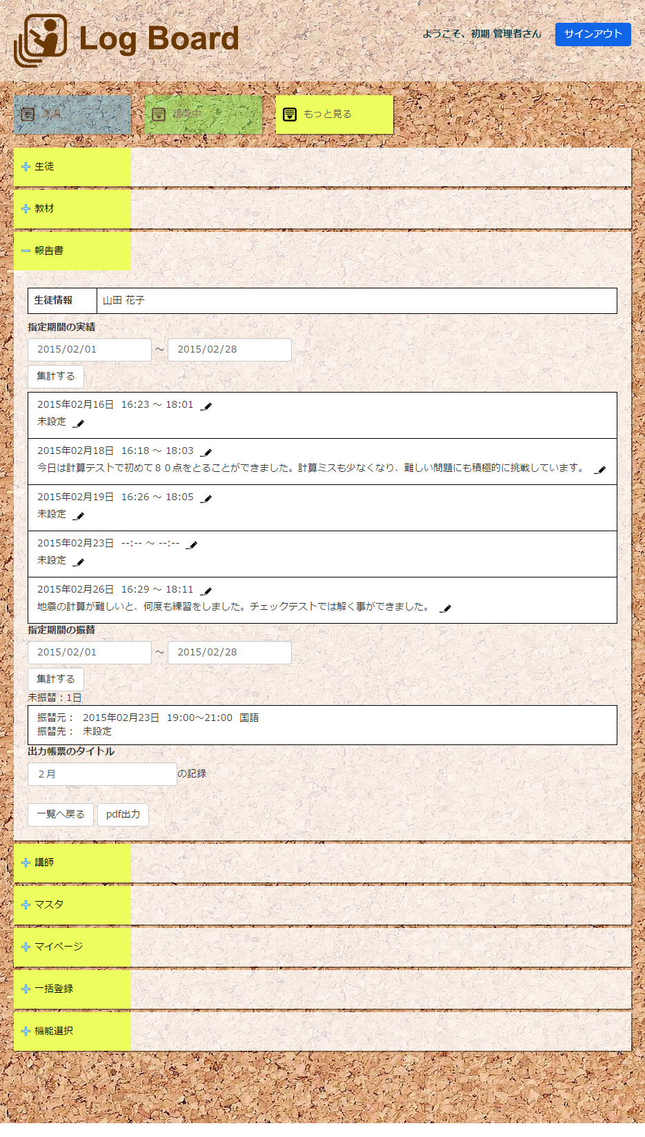 はじめまして、Log Board(ログボード)を開発したコラボプラネットの西原です。私も皆様と同様に学習塾を経営しています。 教室を開くにあたって、生徒の管理をどうしようかと色々なサイトを調べました。しかし、欲しい機能がなかったり、 価格が高くて導入できなかったりと、結局、これだ!というものを見つけることができませんでした。 そこで開発したのがこの生徒管理システムです。PC、タブレットどちらにも対応した操作性の高い管理システムです。 同じ悩みを持つ方にも使って頂きたいと思い、基本機能は無料でご利用頂けます。 日々の教務のサポートにご利用ください。